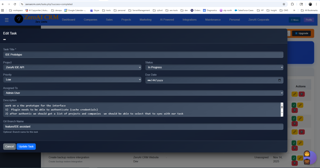For CFOs and Project Managers, the IDE Assistant is a window into the production floor. As developers select tasks directly from the ZeroAI CRM Project Management section, the system updates live status reports.