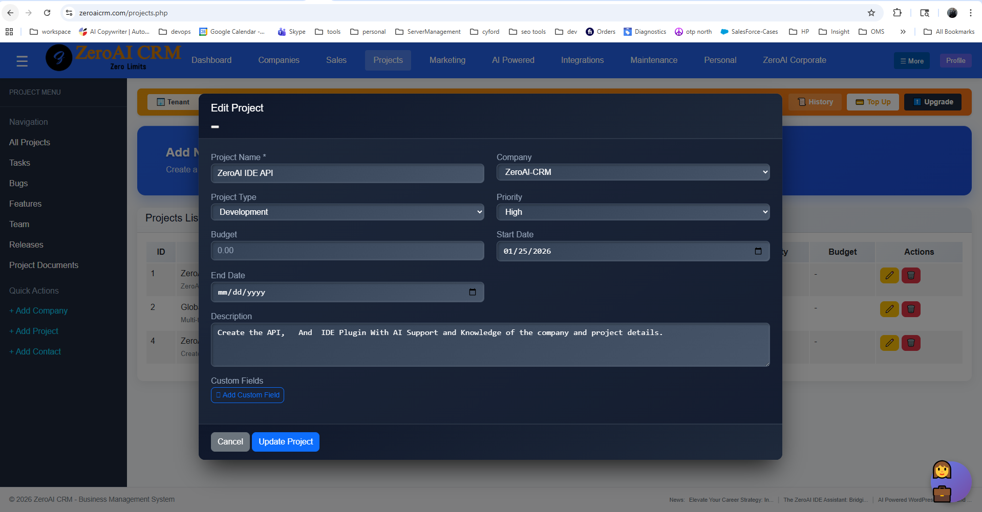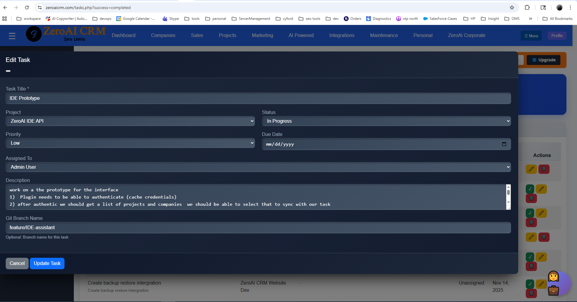 For CFOs and Project Managers, the IDE Assistant is a window into the production floor. As developers select tasks directly from the ZeroAI CRM Project Management section, the system updates live status reports.